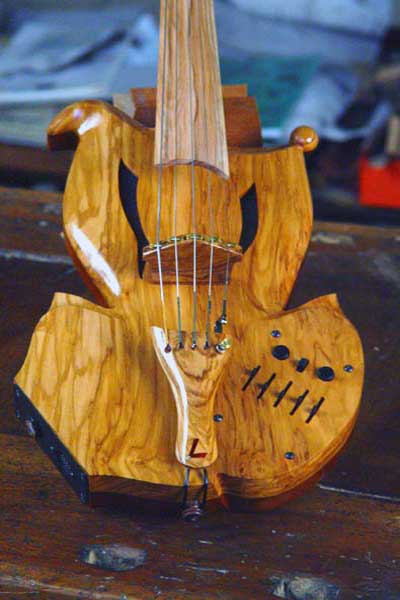 Ho continuato il lavoro costruendo un altro violino senza cassa a 4 corde in acero e ciliegio con tastiera e cordiera in legno di rosa.